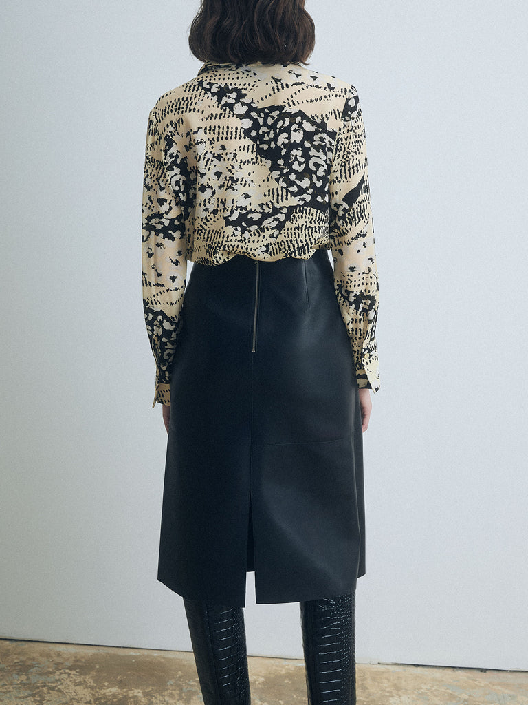 Long-sleeve animal print silk blouse with a semi-fitted silhouette.