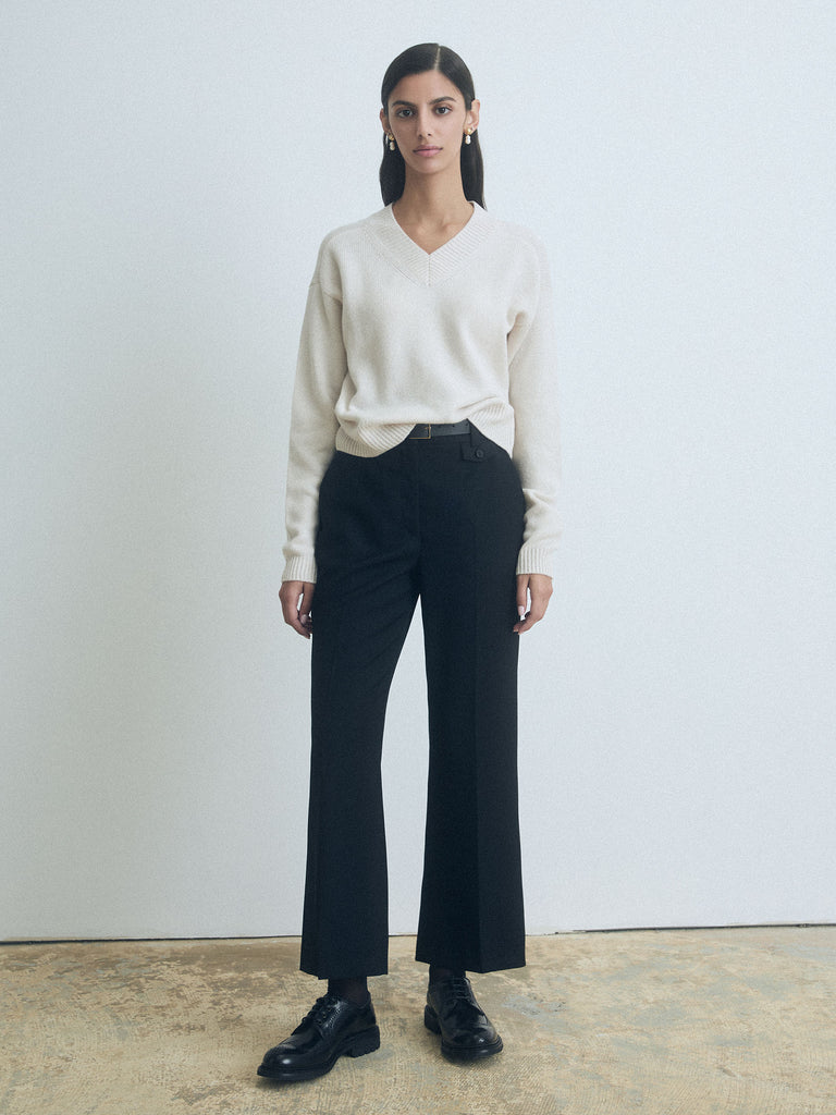 Tailored virgin wool pant with slash pockets, back welt pockets, and a zip closure. Finished with belt loops.