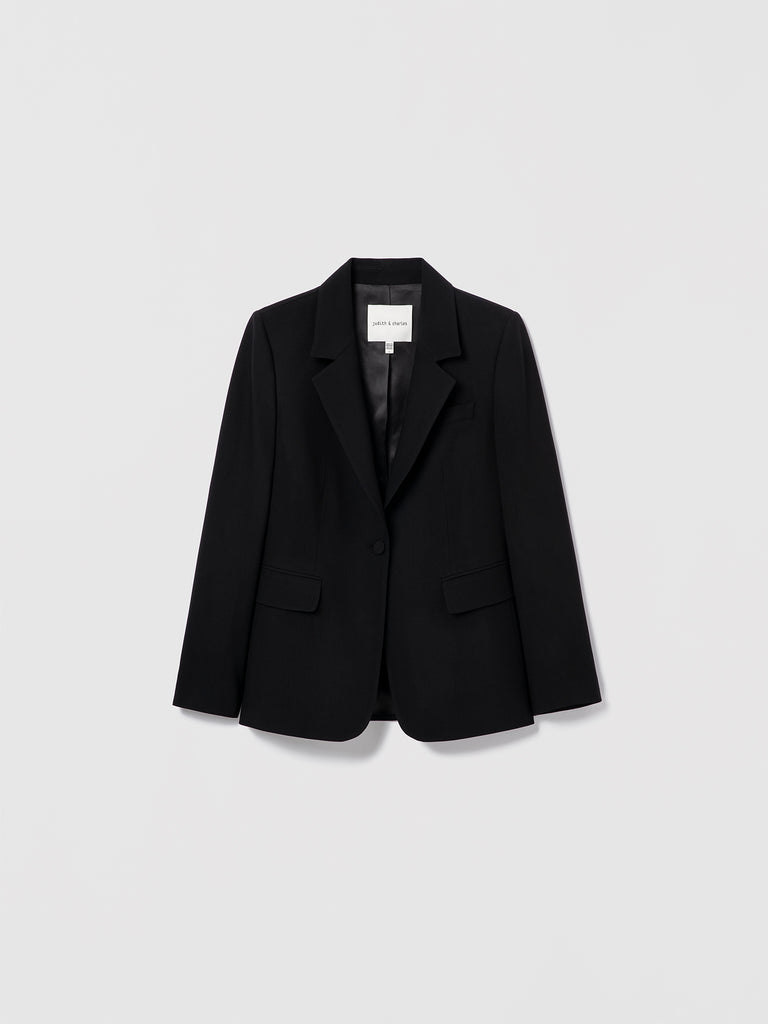 Structured virgin wool-blend jacket with a notch lapel, flap pockets, and self-covered buttons. Fully lined, with a single back vent.